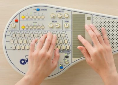 Instrument électronique facile à jouer, il combine des accords préprogrammés, une surface tactile à gratter et des rythmes intégrés.
