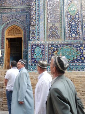 Nous devons nous arrêter dans l’iwan de la mosquée. En effet, depuis l’implosion de l’URSS, la nécropole est de nouveau un important lieu de pèlerinage.