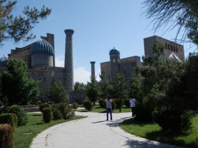 Sachons d’abord que cette ville de Samarcande est située dans un de ces «fameux » pays en stan (Ouzbeki, Tadjiki, Kazakh, Afghani, Kirghizi), plus précisément dans le pays des Ouzbeks, à 6 457 km de Lyon (soit environ à 77 heures de route selon un itinéraire calculé par Google). On peut donc s’y rendre en voiture (bonne chance !), en train (attention, le transsibérien n’y passe pas. Le plus confortable est, pour le moment le TGV ouzbek à partir de la gare de Tachkent), en bus, en vélocipède (hé oui !), en taxi collectif, en avion (liaison directe tous les jours à partir de Moscou par la compagnie Aeroflot), mais plus du tout juché sur un chameau de Bactriane dans une caravane (dommage… mais, cela évite le mal de mer ; de toute manière, tous les caravansérails sont fermés en Ouzbékistan.)