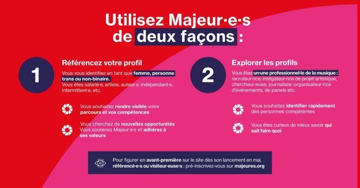 Majeur.e.s est le premier annuaire professionnel inclusif qui vient de voir le jour cette semaine, réunissant des centaines de profils de la musique afin de rendre plus visibles les professionnel-les femmes, personnes trans et non binaires. Cet outil gratuit permet de faire des recherches par localisation, métiers et compétences recherchées, et permet aussi de déposer son propre CV si on le  souhaite.
