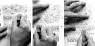L’arme principale dans ce livre, ordinaire et originale, est une gomme qui efface les mots et la continuité du récit. Celui-ci se poursuit alors que la gomme retire les traces, les indices, et le sens à la vigilance du lecteur.