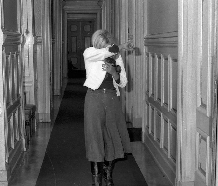 5 juin 1975. Ulla porte-parole des prostituées lyonnaises (qui occupent l’église Saint-Nizier à Lyon 2eme), se cachant des photographes dans les couloirs de l’hôtel de ville, avant d’être reçue par Louis Pradel. Copyright Archives Le Progrès de Lyon