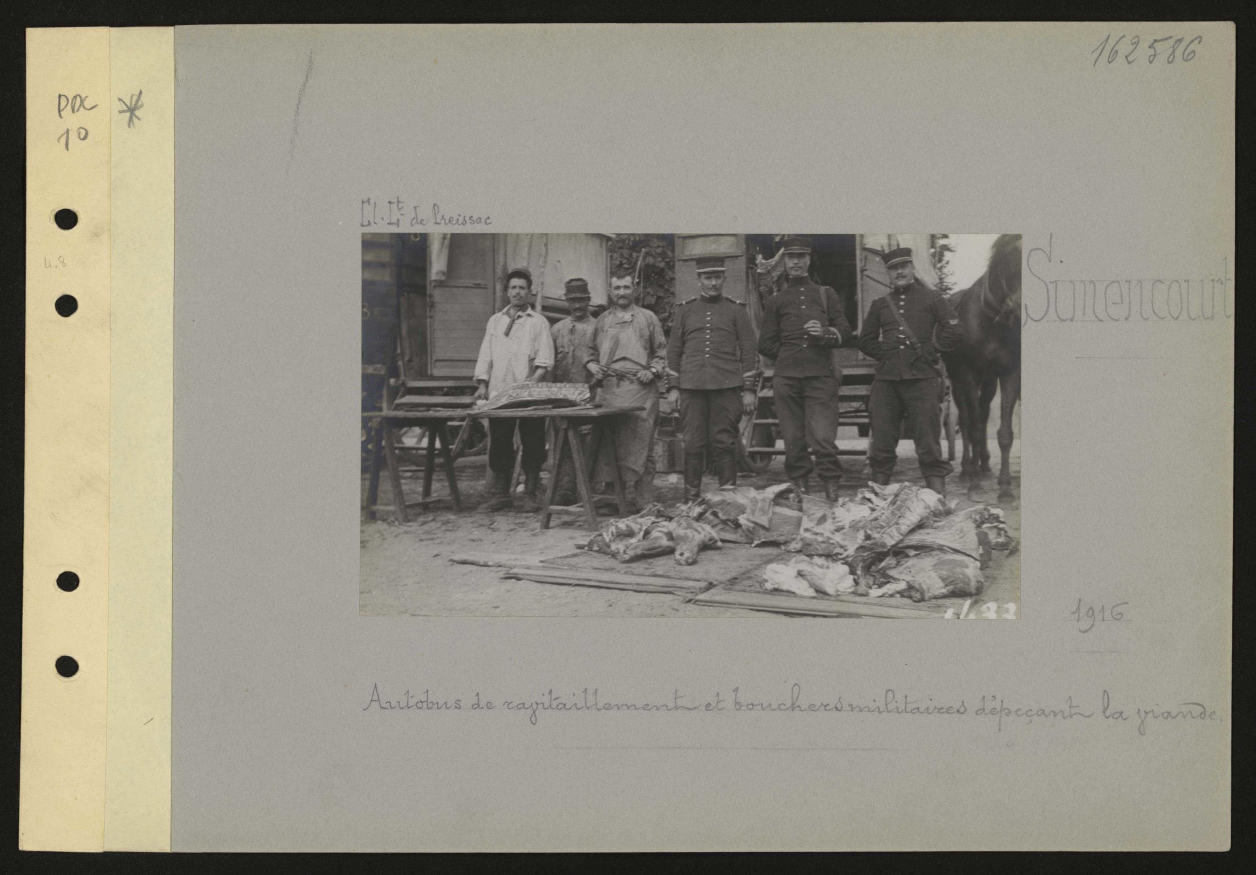 Autobus de ravitaillement et bouchers militaires dépeçant la viande, Simencourt, 1916, coll. La Contemporaine