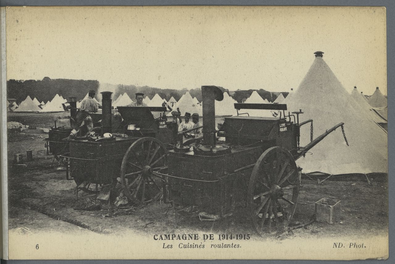 La première période du conflit est la guerre de mouvement. Le fantassin doit alors lui-même apporter ses vivres, arriver au bivouac, éplucher les pommes de terre, etc… Cela change en 1915, lorsqu’on installe des cuisines roulantes.