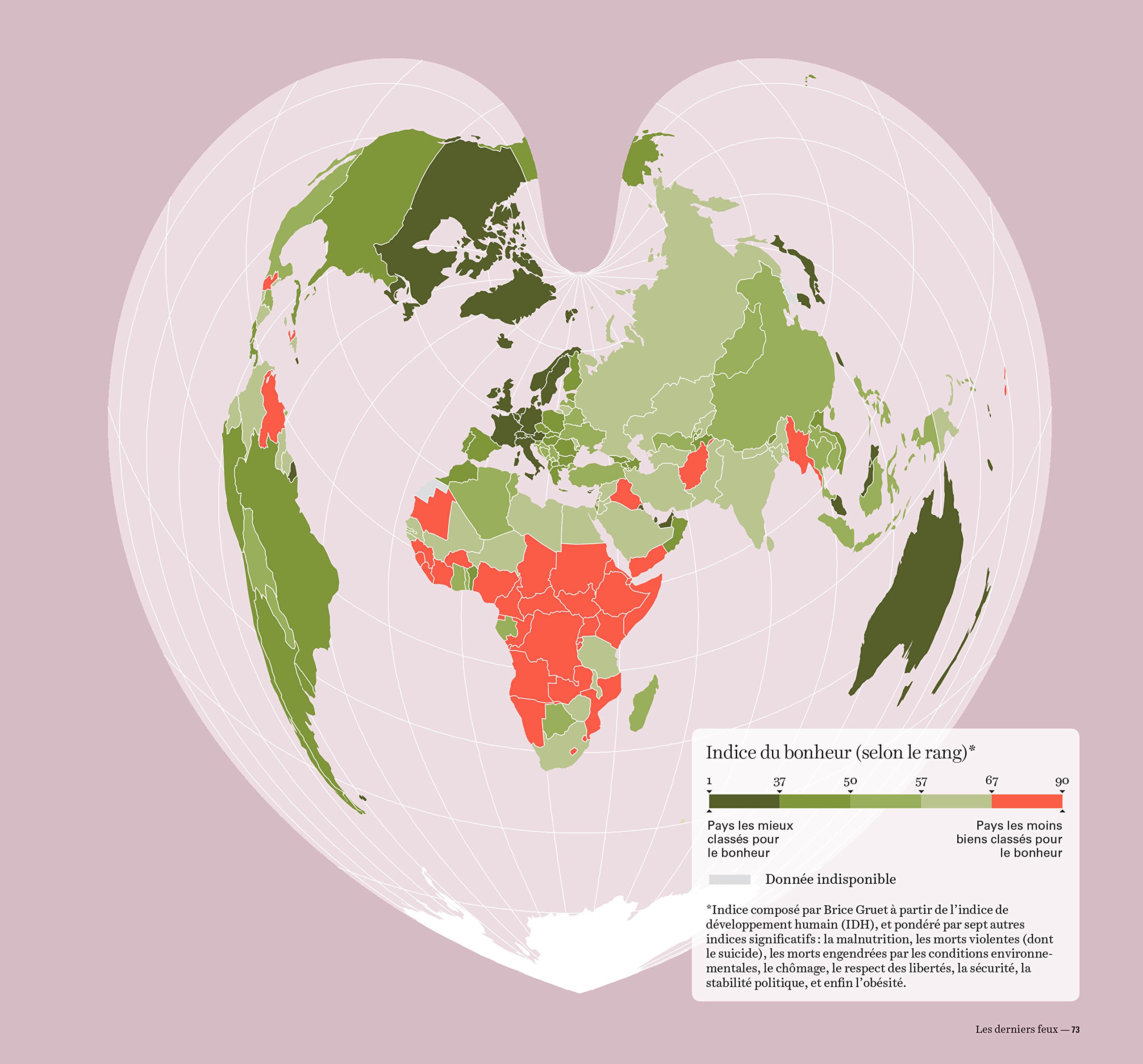En 1972, Jigme Singye Wangchuck, alors roi du Bhoutan, théorise la notion de Bonheur Nationale Brut (BNB) qui lui permet de mesurer le degré de bonheur de ses sujets. A la différence du PIB, cet indice se base sur l’épanouissement d’un pays plutôt que sur sa richesse. Dans sa Géographie du bonheur, le géographe et essayiste Brice Gruet s’en inspire pour proposer son propre indice, composé des critères suivants : l’indice de développement humain pondéré par les sept autres données significatives que sont la malnutrition, les morts violentes ou engendrées par les conditions environnementales, le chômage, le respect des libertés, la sécurité, la stabilité politique et l’obésité.