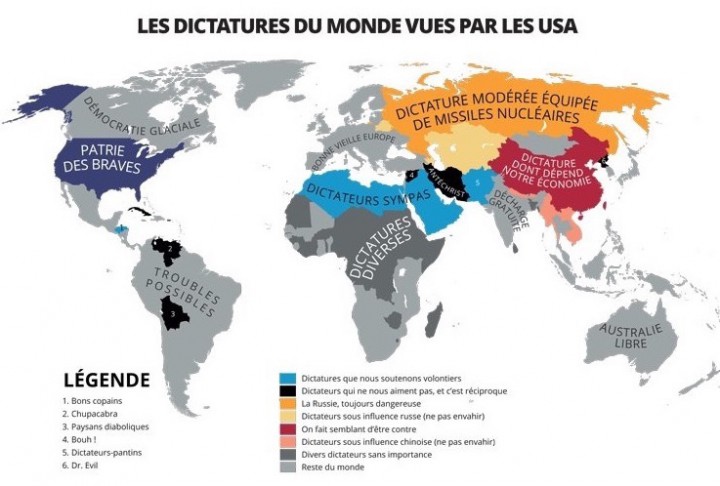 Yanko Tsekov, graphiste bulgare, puise son inspiration dans ses voyages réalisés en Europe et dans le monde, au cours desquels il a été confronté à de nombreux de préjugés et de clichés. Le projet “mapping prejudice” voit le jour en 2009 et donne lieu à une trentaine de cartes “sans prétention scientifique”, liées à la culture populaire, l’histoire ou l’actualité politique. Sur un ton satirique et décalé, Yanko Tsekov souhaite simplement faire prendre conscience de ces préjugés, sans avoir pour objectif de s’en débarrasser. Voici par exemple la Carte des dictatures du monde vues par les USA, réalisée sous l’ère du président Obama :
