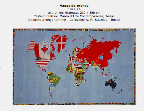 Alighiero Boetti, peintre, sculpteur et plasticien italien, s’inscrit dans le mouvement de l’Arte Povera. Voyageur, adepte des cultures étrangères et passionné de géopolitique, il a imaginé une série de planisphères brodés, regroupés sous le titre Mappa. Il a confié la réalisation des broderies à des femmes en Afghanistan et au Pakistan entre 1971 et 1973. Exécutées d’après les drapeaux de chaque pays, ces cartes subissent des modifications esthétiques liées à l’évolution des frontières ou des emblèmes nationaux.