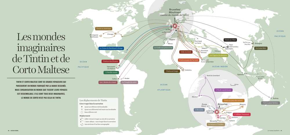 Julien Champigny, géographe et enseignant, a entreprit de cartographier Le monde imaginaire de Tintin et de Corto Maltes. Sur ces deux planisphères, il a fait apparaître les déplacements des deux protagonistes en indiquant les titres des albums en lien avec chaque lieu. Sur la carte des voyages de Tintin, ci-dessous, on peut constater que les aventures du reporter l’ont mené sur chacun des cinq continents. Par le biais de cette cartographie de la fiction, Julien Champigny s’accorde à montrer “une image du monde qui correspond à ce que le héros découvre et fait découvrir au lecteur au fil de ses aventures”.