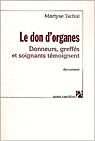 Le don d’organes : donneurs, greffés, et soignants témoignent par Tschui Marlyse, ed. Anne Carrière : Parce que la greffe d’organes est le fruit d’un étrange mariage entre la vie et la mort, nombreux sont ceux qui hésitent à signer une carte de donneur.