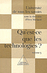 Qu’est-ce que les technologies ? dirigé par Yves Michaud, O. Jacob, 2001. Les plus grands spécialistes français sont réunis dans ce nouveau volume consacré aux grandes questions que posent les nouvelles technologies et l’informatique en terme d’énergie, de matériaux, de pollution et de remèdes.